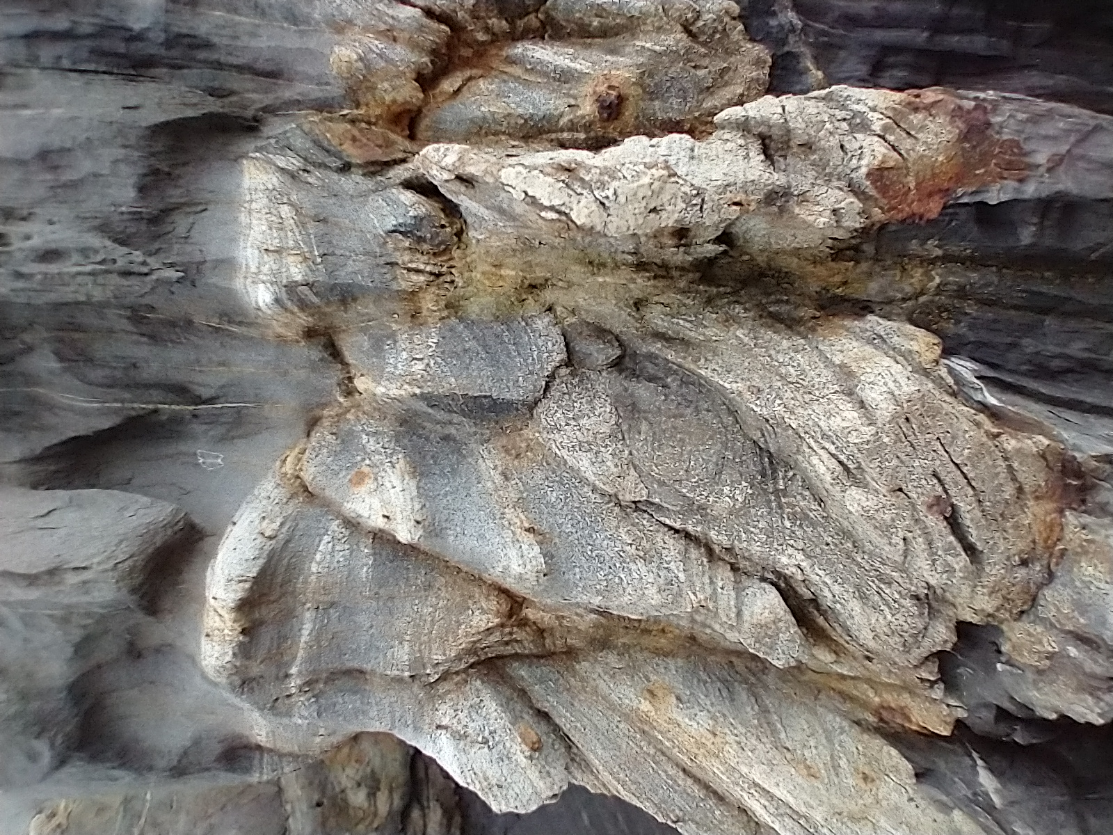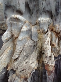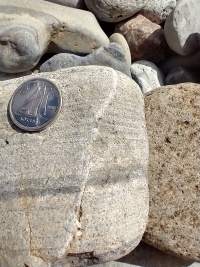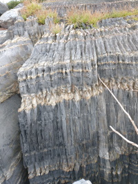 - Close up showing crossbedding in the sandstone. This reveals ancient currents in the water when the sand was deposited.