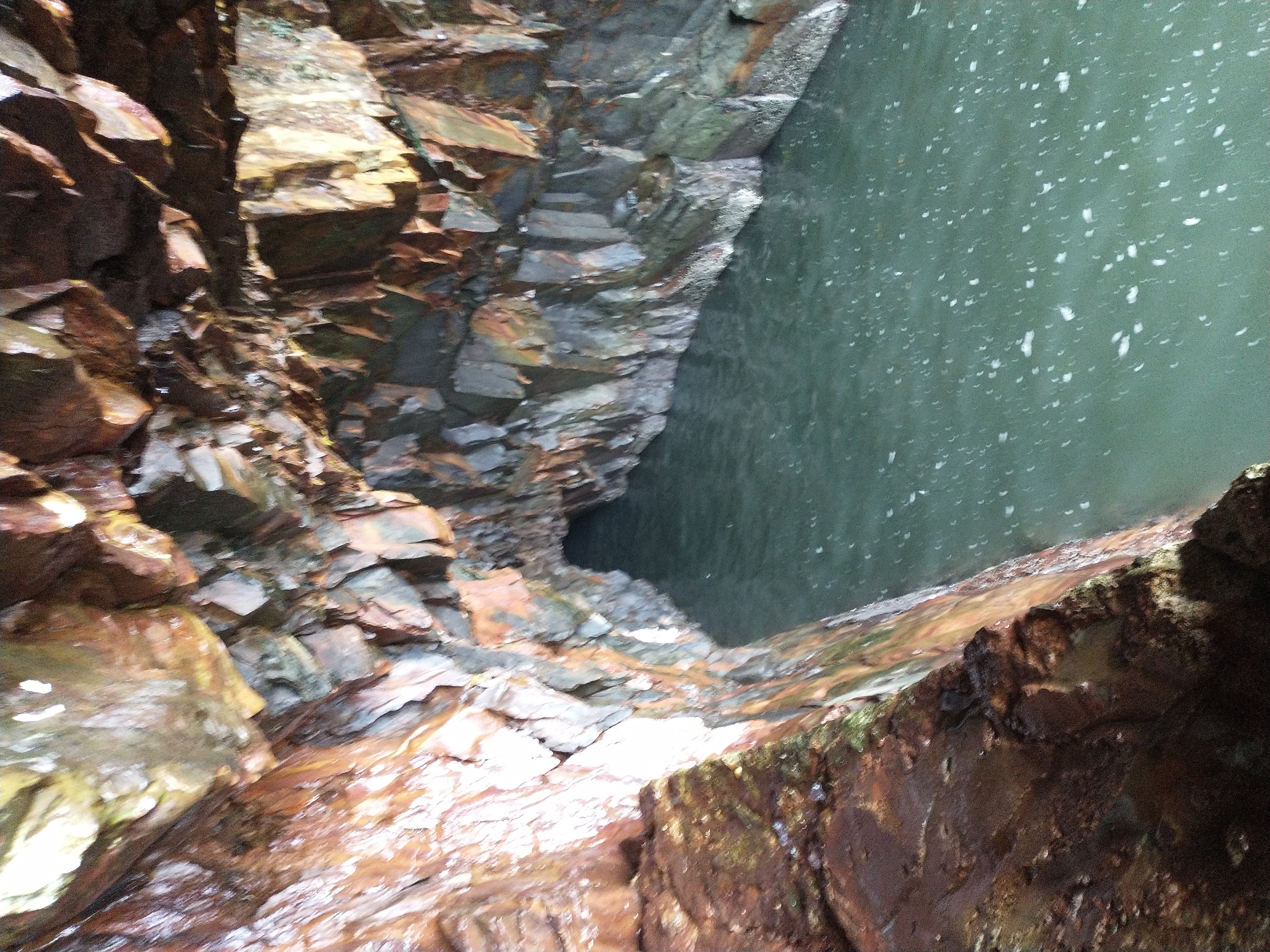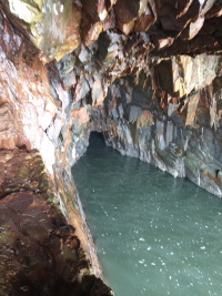- at the Ovens Nature Park the same mudstone that is horizonal at Blue Rocks is now tipped nearly to vertical. There are sea caves. When the waves are just right, it compresses the air in the cave which then explodes in a loud but very low pitched boom, more like a feeling than a sound.