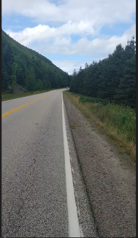 The Google estimates of riding duration are pretty good, but my actual travel time was about double that with stops to look at the scenery and of course eat. My average moving speed was about 16 kmh, with a top speed of 63 kmh on the downhill. The hard day was day three. Cornerstone to Pleasant Bay includes climbing French Mountain (400 meters) and North Mountain (also about 400 meters).