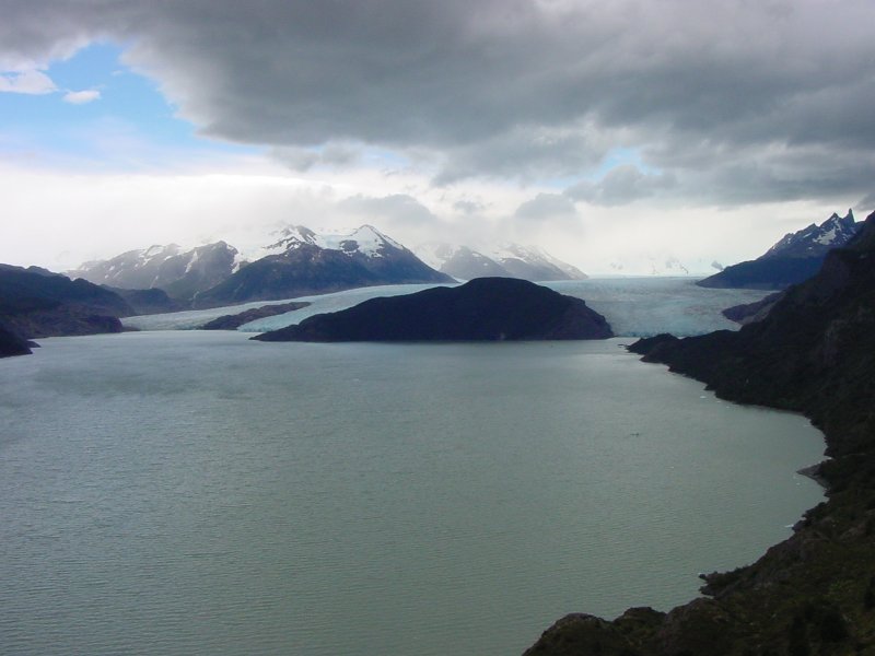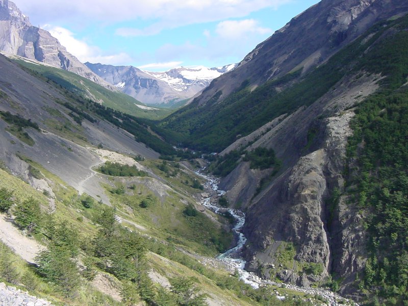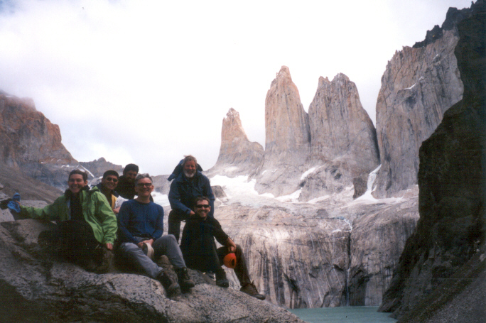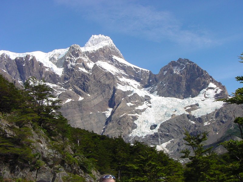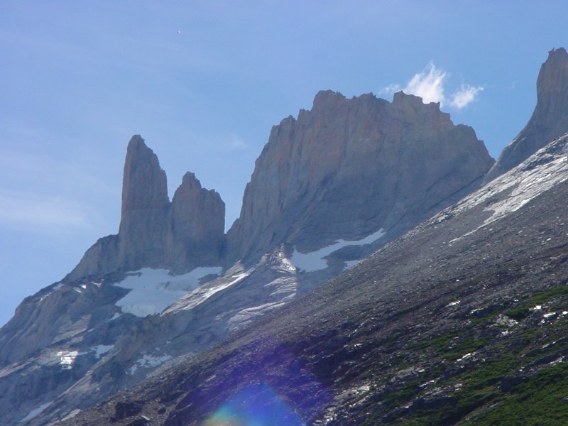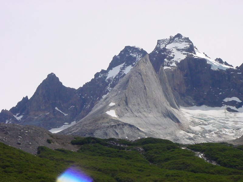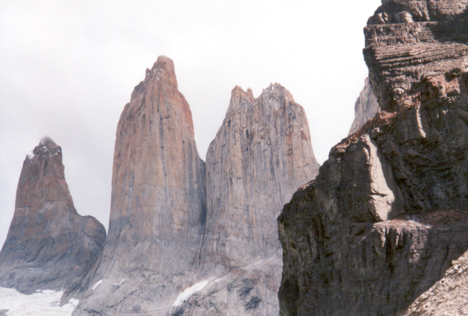 We had three long hikes in this park. The first hike (16 kilometers) took us up to a view of Grey Glacier. Like the Moreno, this comes down from the Campo Hielo del Sur. The second day's hike (24 kilometers) led to the Italian camp, then up the French Valley. The third day we hiked up to the Chilean Camp, then up to the Torres themselves, which are not visible from outside.