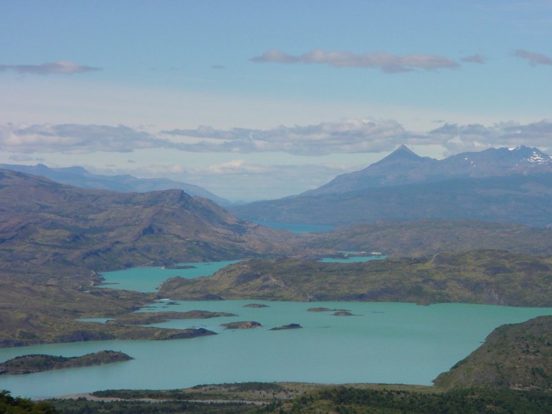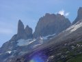 Our next stop was the Parque Nacional Torres (Towers) del Paine, in Chile. The geology of the park is similar to that of Los Glaciares in Argentina - granite intrusions into sedimentary rock. Approaching the park from the south, one sees first the Cuerno (horns) del Paine. Here, the very top of the mountain is a dark metamorphic rock (Cretaceous) that was baked by the heat of the granite to a greater hardness. The Cuernos are often mistakenly labelled as the Torres del Paine, even on some travel web sites that should know better.
